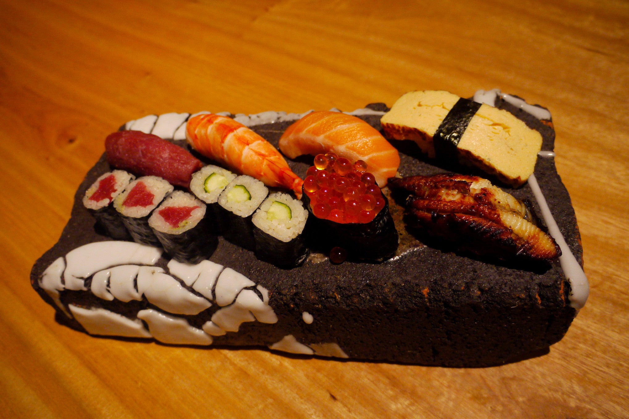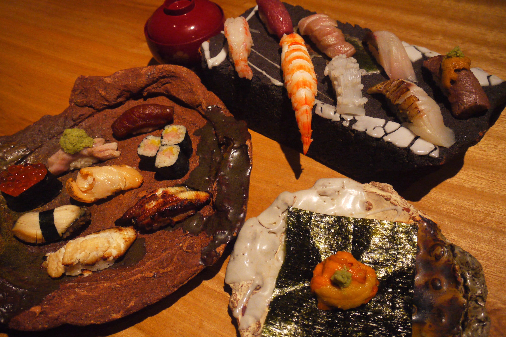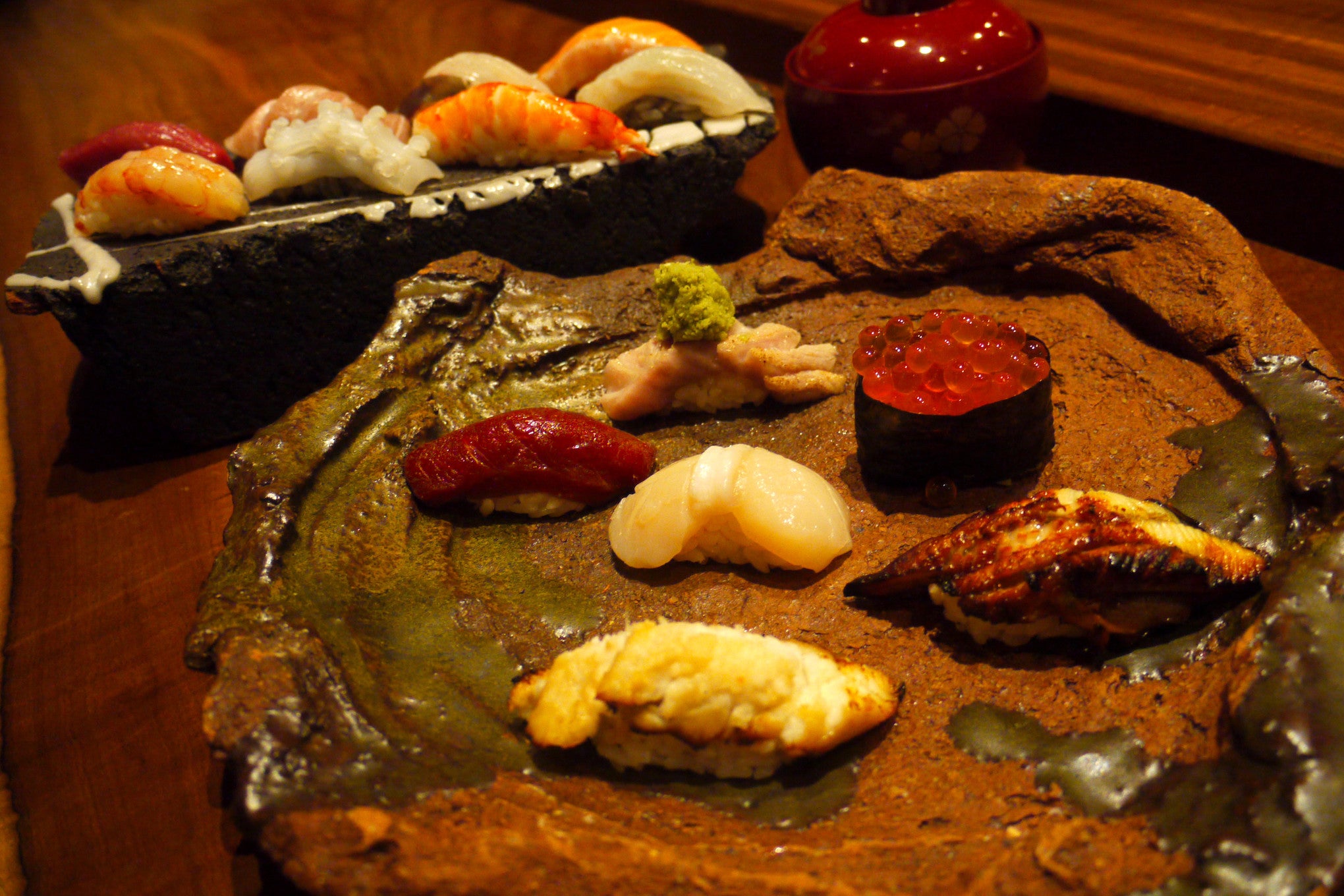 Red tuna, fatty tuna, pickled fatty tuna, grilled blackthroat seaperch, live marinated striped jack, squid ink rice, swordfish, live whelk, grilled Japanese beef rump, live boiled tiger prawn, sweet shrimp, kelp marinated, large salmon roe, soy sauce pickled, raw Hokkaido sea urchin, grilled eel, homemade boiled conger eel